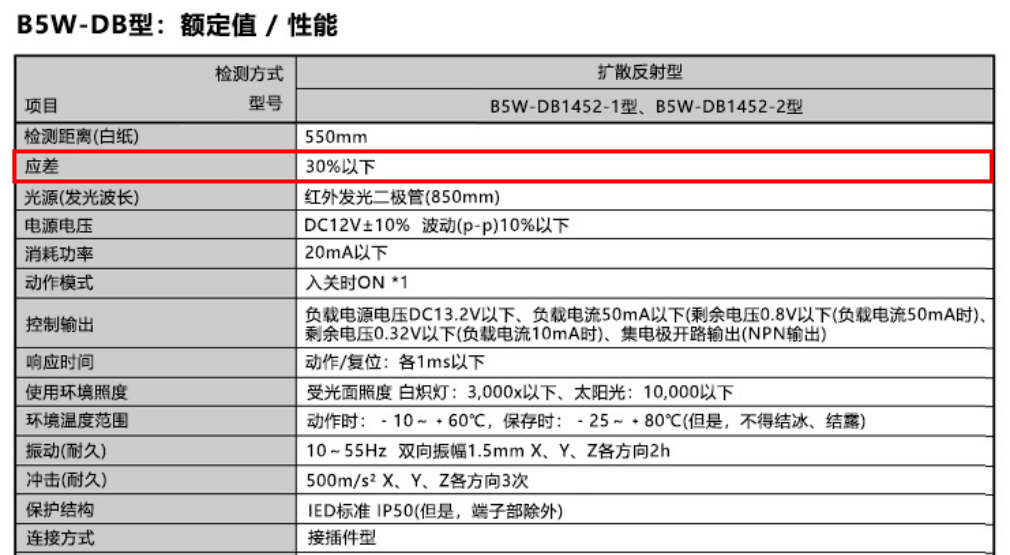 反射型光電傳感器上的動作距離是指使檢測物體接近傳感器時切換為ON的距離。此外,使檢測物體離開該范圍并切換為OFF的距離稱為復位距離。這個動作距離與復位距離之差稱為“應差距離”(參考見下圖)。如果無應差,則會在動作區域附近出現反復切換ON/OFF的現象(震顫)。為了防止這種現象的發生,需要設定應差。B5W-DB型的應差規定在30%以下。例如,某單體以800mm的距離切換為ON時,表示復位距離為800 mm X 1.3 =1,040 mm以下。