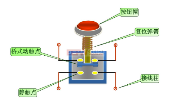 按鈕一般由按鈕帽、復(fù)位彈簧、橋式動觸頭、靜觸頭、支柱連桿及外殼等部分組成。