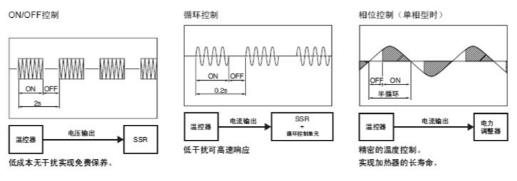 相位控制接受溫控器的電流輸出4~20mA的信號, 使輸出量每半循環(huán)發(fā)生變 化。可進行高精度的溫度控制, 多用于半導(dǎo)體制造裝置中。
