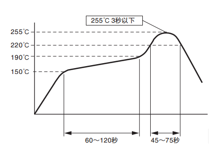 在下圖的端子溫度曲線范圍內(nèi),進(jìn)行回流焊接。有些回流焊接的裝置峰值很高,因此請(qǐng)務(wù)必預(yù)先進(jìn)行確認(rèn)試驗(yàn)