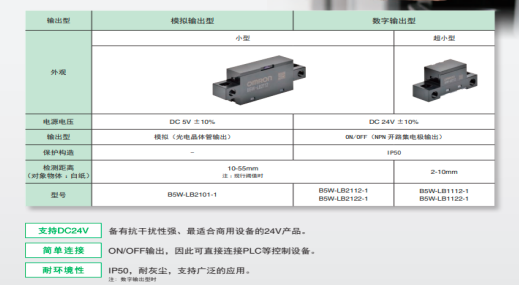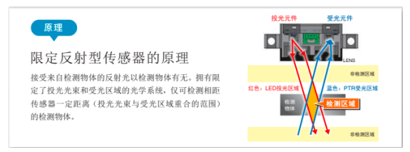 B5W-LB系列是限定反射型傳感器(如圖三),搭載了由4種超環(huán)面透鏡組成的歐姆龍自行設(shè)計的光學(xué)鏡頭。只需微弱的反射光即可實(shí)現(xiàn)穩(wěn)定檢測,不易受檢測物體的顏色和表面狀態(tài)影響,可在廣泛檢測區(qū)域內(nèi)檢測黑紙和透明玻璃等。