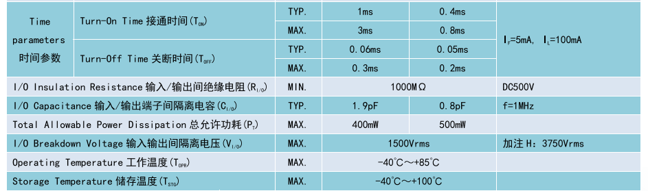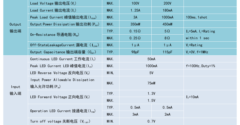 (Relay 光MOS 繼電器 SOP4),Product Model產(chǎn)品型號:BCY215S、BCY217S,Contact Form 觸點形式:1a,Ambient Temperature 25'C,測試環(huán)境溫度 25°℃