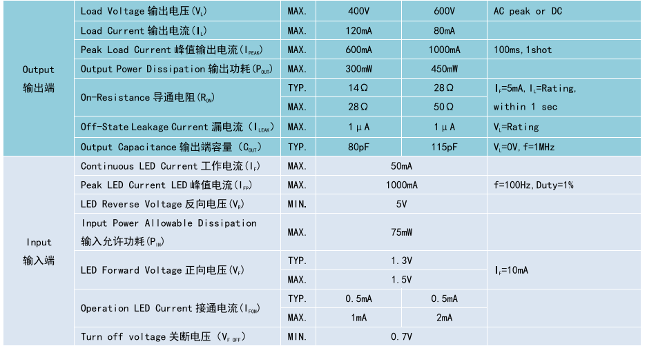 (Relay 光 MOS 繼電器 SOP4),Product Model產品型號:BCY214S/BCY216S,Contact Form觸點形式:1a,Ambient Temperature 25°C,測試環境溫度 25°C