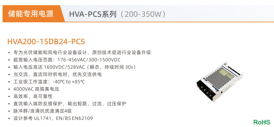 儲能電源HVA200-15DB24-PCS, ·專為光伏儲能和風電行業設備設計,原創技術促進行業設備升級 ·超寬輸入電壓范圍:176-456VAC/300-1500VDC ·輸入電壓高達1600VDC/528VAC(瞬態,持續時間 30s) ·當交流、直流同時供電時,優先交流供電 ·工業級工作溫度:-40℃to +85℃ ·4000VAC高隔離電壓 ·高效率、高可靠性 ·直流輸入端防反接保護,輸出短路、過流、過壓保護 ·脈沖群/浪涌抗擾度滿足4級 ·設計參考 UL1741,EN/BS EN62109