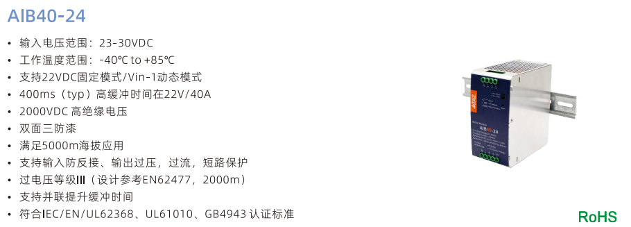 緩沖模塊電源AIB20-24 ?輸入電壓范圍:23-30VDC ?工作溫度范圍:-40°Cto +85°C ?支持22VDC固定模式/Vin-1動態(tài)模式 ?400ms(typ)高緩沖時間在22V/20A ?2000VDC高絕緣電壓 ?雙面三防漆 ?滿足5000m海拔應用事 ?支持輸入防反接、輸出過壓,過流,短路保護魯 ?過電壓等級川(設計參考EN62477,2000m) ?支持并聯(lián)提升緩沖時間 ?符合IEC/EN/UL62368、UL61010、GB4943認證標準