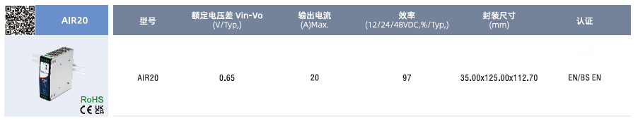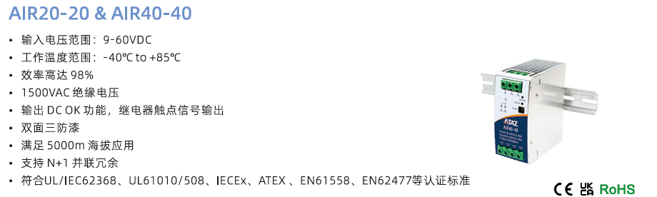 冗余模塊電源AIR20 ?輸入電壓范圍:22-60VDC ?工作溫度范圍:-40℃℃to +80℃C ?效率高達 97% ?1500VAC絕緣電壓 ?兩路輸入狀態(tài)指示燈,繼電器觸點信號輸出 ?模塊電源,具有DCOk功能 ?滿足 5000m 海拔應用 ?支持 N+1 并聯冗余 ?通過EN62368,符合IEC/UL62368、EN61558、EN60335認證標準