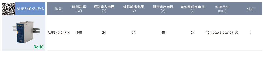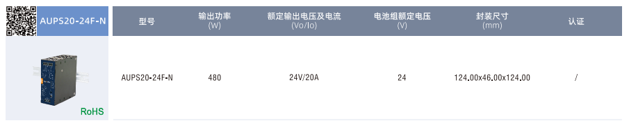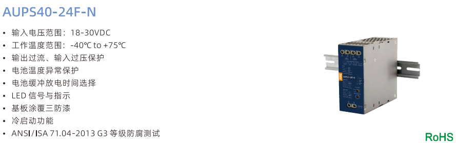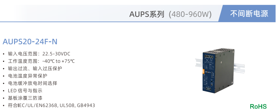 不間斷電源AUPS20-24F-N ??輸入電壓范圍:22.5-30VDC ??工作溫度范圍:-40°Cto +75°℃ ??輸出過流、輸入過壓保護 ??電池溫度異常保護 ??電池緩沖放電時間選擇 ??LED 信號與指示 ??基板涂覆三防漆 ??符合IEC/UL/EN62368,UL508,GB4943