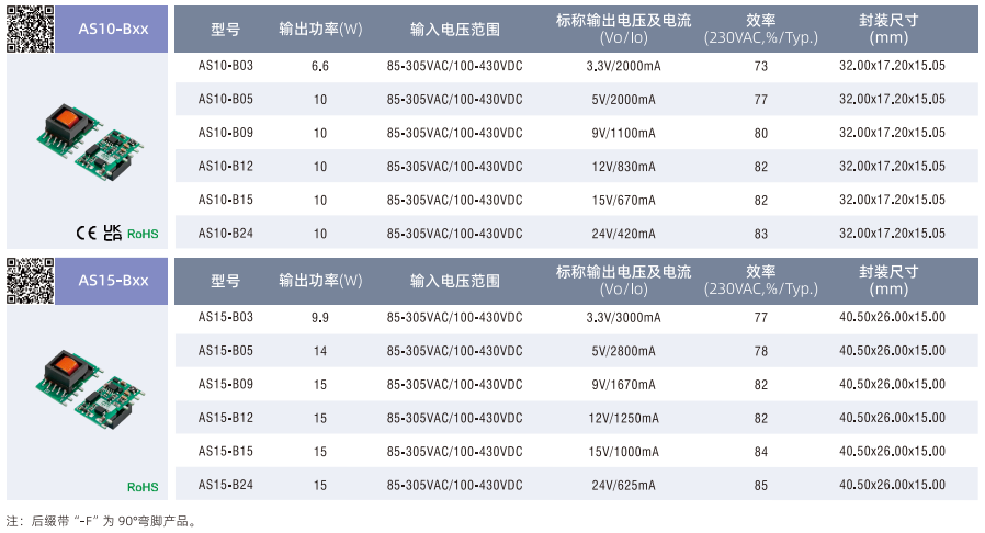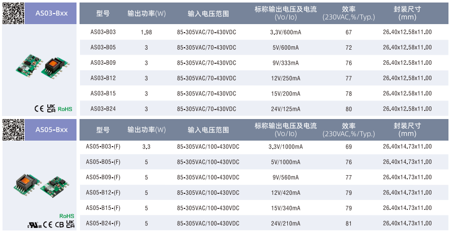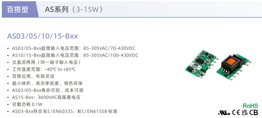 ?板載式電源AS03/05/10/15-BxX ??AS03/05-Bxx超寬輸入電壓范圍:85-305VAC/70-430VDC ??AS10/15-Bxx超寬輸入電壓范圍:85-305VAC/100-430VDC ??交直流兩用(同一端子輸入電壓) ??工作溫度范圍:-40°Cto +85°C ??百搭應(yīng)用、布局靈活 ??超小體積、高功率密度、綠色環(huán)保 ??AS03/05-Bxx壽命可控、成本可調(diào) ??AS15-Bxx:3600VAC高隔離電壓 ??空載功耗 0.1W ??AS03-Bxx符合IEC/