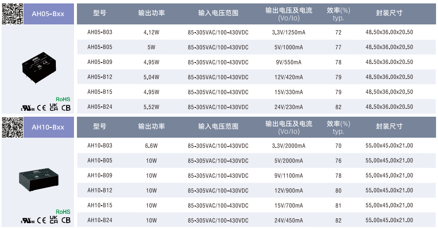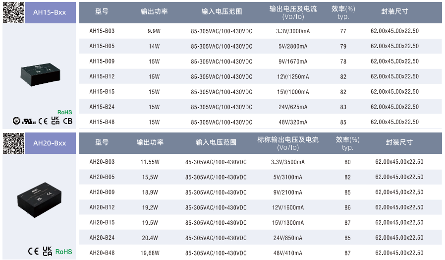 電源模塊AH05/10/15/20-BxX ??寬輸入電壓范圍:85-305VAC/100-430VDC ??工作溫度范圍:-40℃℃to+85℃℃ ??4000VAC高隔離電壓 ??低功耗、高效率、高可靠性 ??輸出短路、過流保護、輸出過壓保護 ??5000m 海拔應用 ??全塑料外殼、符合 UL94V-0 ??過電壓等級I(符合IEC62477-1,2000m 海拔) ??裸機滿足EMICLASSB及浪涌+2KV/±4KV要求