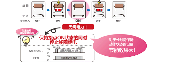 磁保持繼電器是近幾年發(fā)展起來的一種新型繼電器,也是一種自動開關(guān)。和其他電磁繼電器一樣,對電路起著自動接通和切斷作用。所不同的是,磁保持繼電器的常閉或常開狀態(tài)完全是依賴永久磁鋼的作用,其開關(guān)狀態(tài)的轉(zhuǎn)換是靠一定寬度的脈沖電信號觸發(fā)而完成的.線圈通電時,接點處于on或者off狀態(tài),即使切斷線圈電壓仍能保持該狀態(tài)的功能。在設備的動作狀態(tài)下,停止線圈耗電,實現(xiàn)節(jié)能。這一類的繼電器,叫做磁保持繼電器;