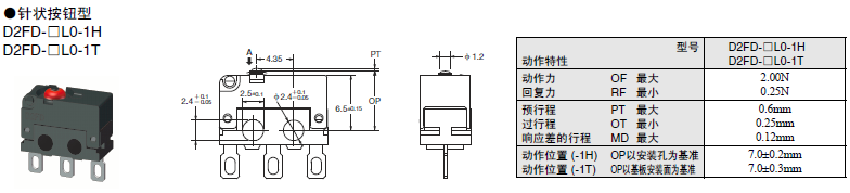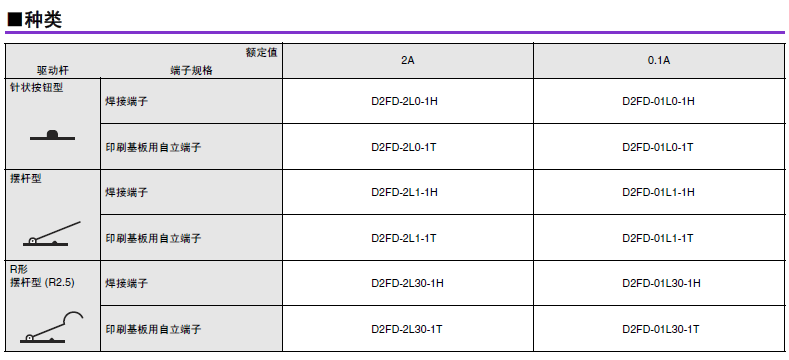D2FD-2 超級小型基本開關(guān) 兼具防塵功能的極超小型基本開關(guān) 利用橡膠封裝的密封結(jié)構(gòu)實(shí)現(xiàn)防塵 (IEC IP6X)。可在有灰塵、紙粉的環(huán)境下使用。 可動片為1片彈簧構(gòu)造,支持AC125V 2A開關(guān),更有微小負(fù)載型可供選擇。 還備有焊接、印刷基板用端子。