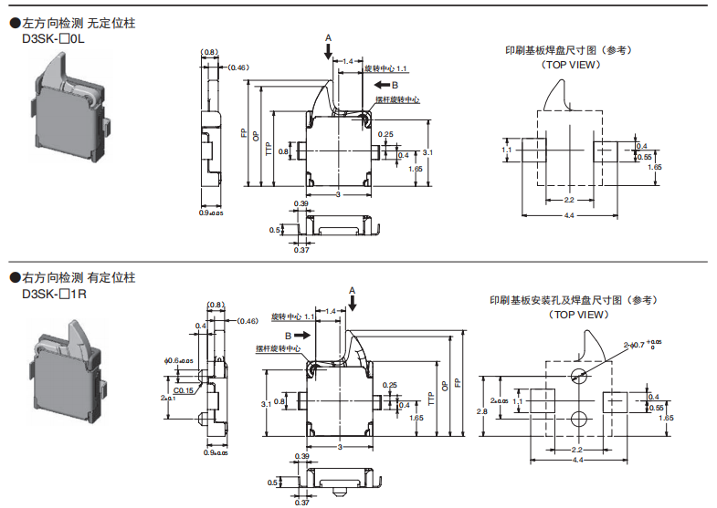 「社內較小級」可實現高精度動作的檢測開關 (寬3.0mm×長3.5mm×厚0.9mm) 小型及薄型,為機器的小型化、薄型化作貢獻。 特定的接點機構,實現了高精度的動作位置及高可靠性的接觸。 長行程提高了使用的便捷性。 接觸規格(1a、1b)及多種擺桿,可適合范圍寬廣的各種用途。