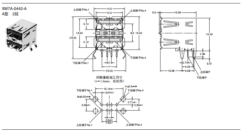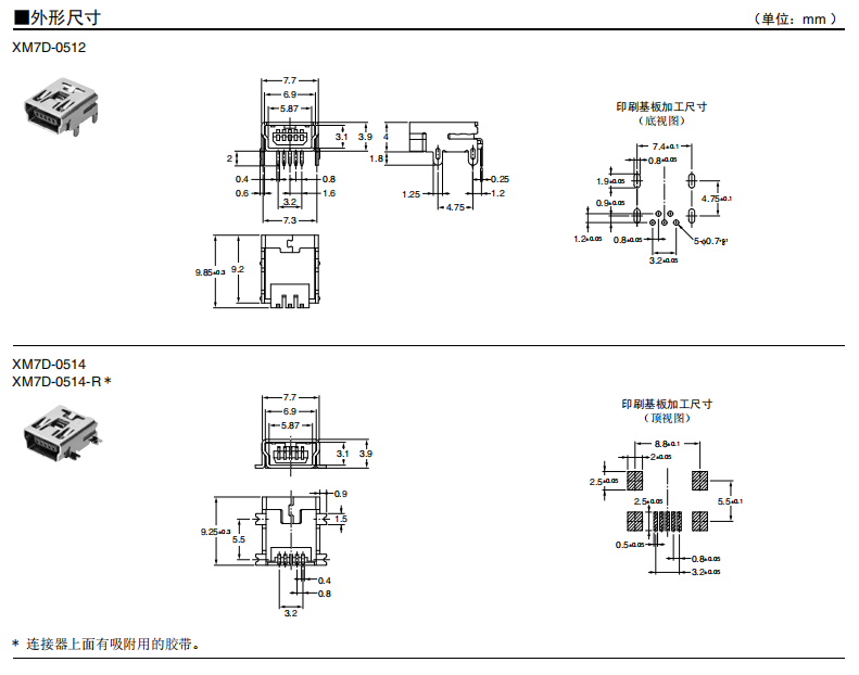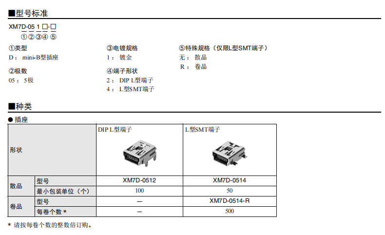 符合USB標準的 小型接口連接器 符合USB2.0標準。 插拔次數可達1,500次。 A型插座封裝在計算機主體、USB集線器等上,B型插座封裝在調制解調器、掃描儀、鼠標等計算機外圍設備上。 有無認證規格,請參見“規格認證”。