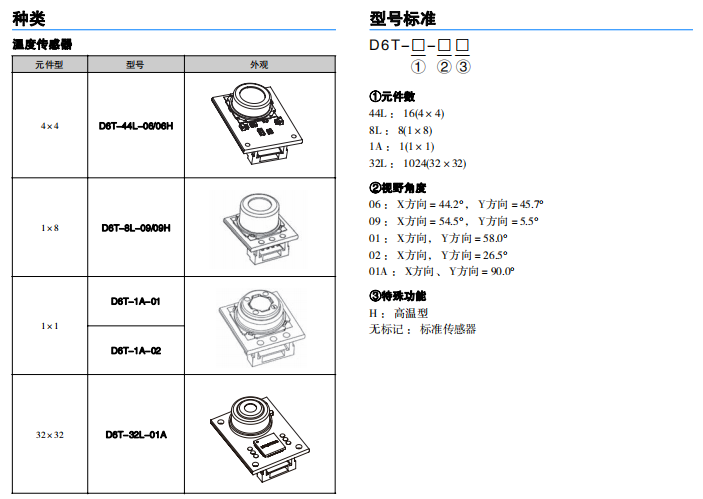 | 型號 | D6T-44L-06/06H | D6T-8L-09/09H | D6T-1A-01 | D6T-1A-02 | D6T-32L-01A | |