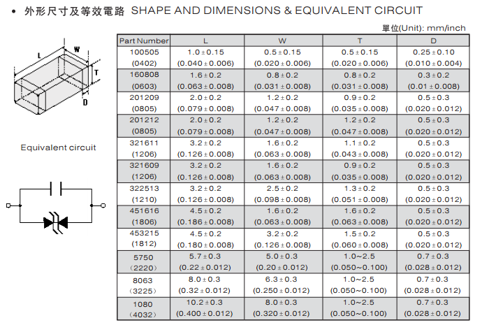 特征: 1、疊層片式陶瓷結構。 2、無引線。 3、溫度范圍:-55℃~+125 ℃。 4、工作電壓范圍V w(dc)=3.3~ 615V。 5、具有雙向限制特性,適合ESD保護。 6、漏電流非常小。 7、寄生電感小、響應速度快(響應時間少于0.5ns)。 8、優良的溫度系數。 9、良好的焊接性能(端電極為三層電鍍)。 應用: 1、防止過電壓:當施加的電壓升高到壓敏電壓時,壓敏電阻器的電流急劇上升,被保護設備的浪涌電壓迅速減小,從而使裝有壓敏電阻器的設備抗浪涌噪聲能力達到相應要求。壓敏